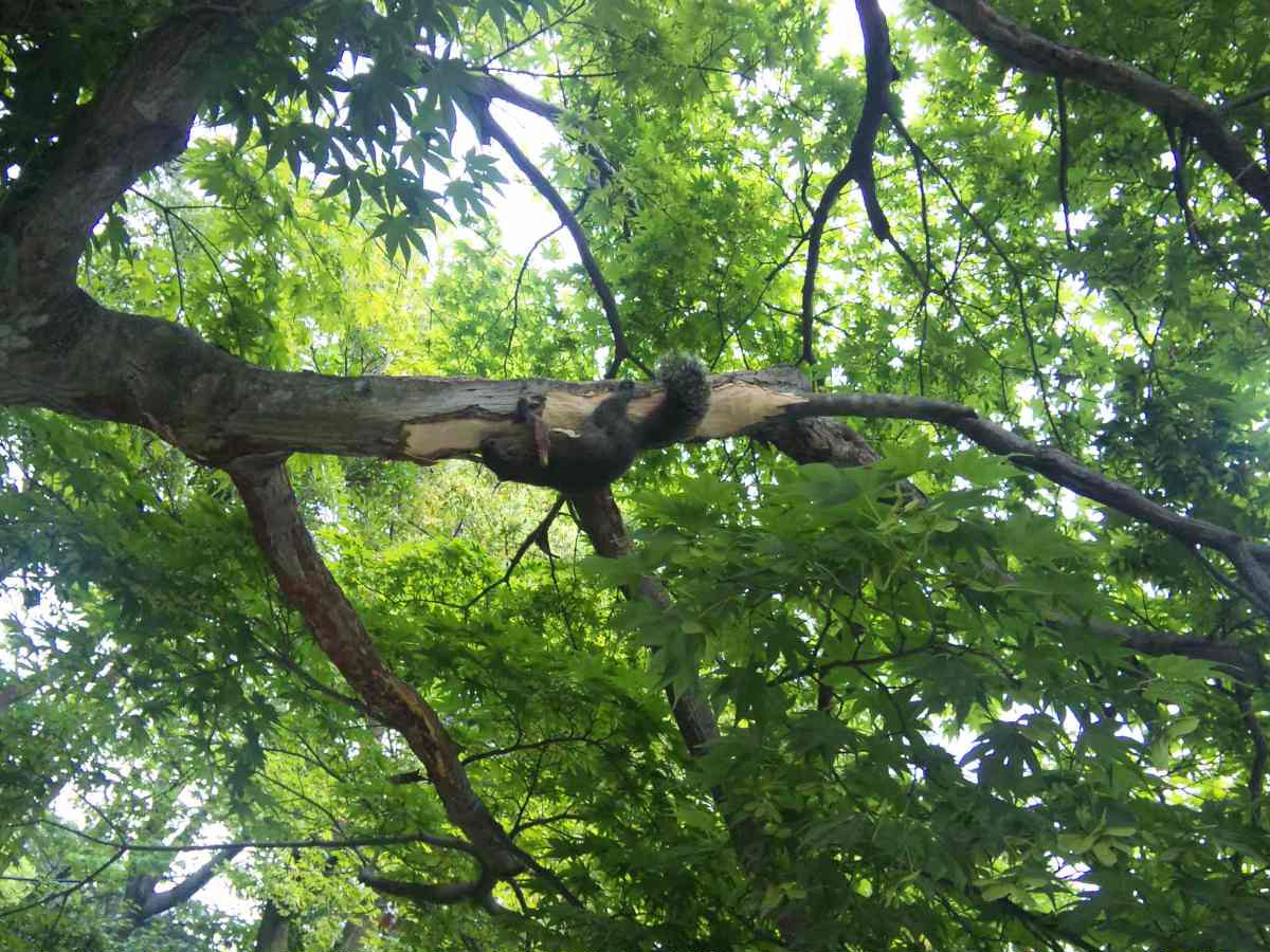よくよく見ると木の枝に人だかりの主が…。