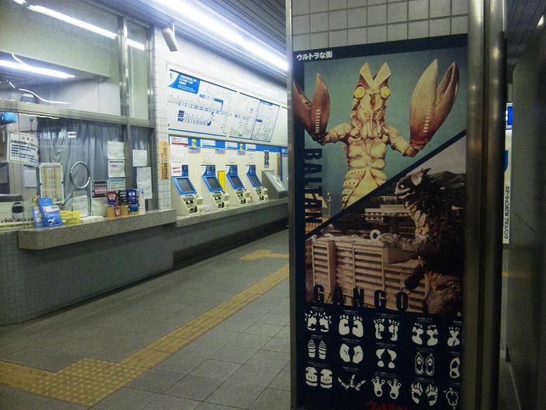 駅の壁と言う壁には、ウルトラマンやバルタン星人が貼りだされ、